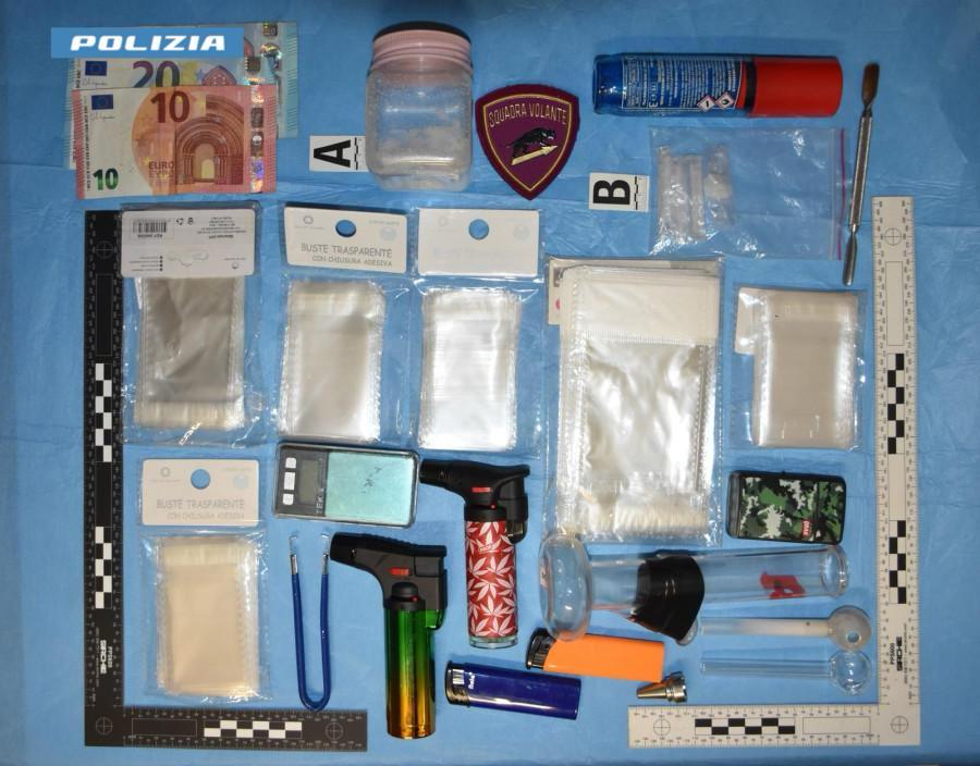La perquisizione ha portato al ritrovamento di un contenitore con 10,7 grammi di sostanza in cristalli, positiva ai test per anfetamina, e quattro dosi già pronte per la vendita, per un peso complessivo di 2,2 grammi. Sono stati sequestrati anche un bilancino di precisione, numerosi involucri in cellophane e altri strumenti utili al consumo e al confezionamento.