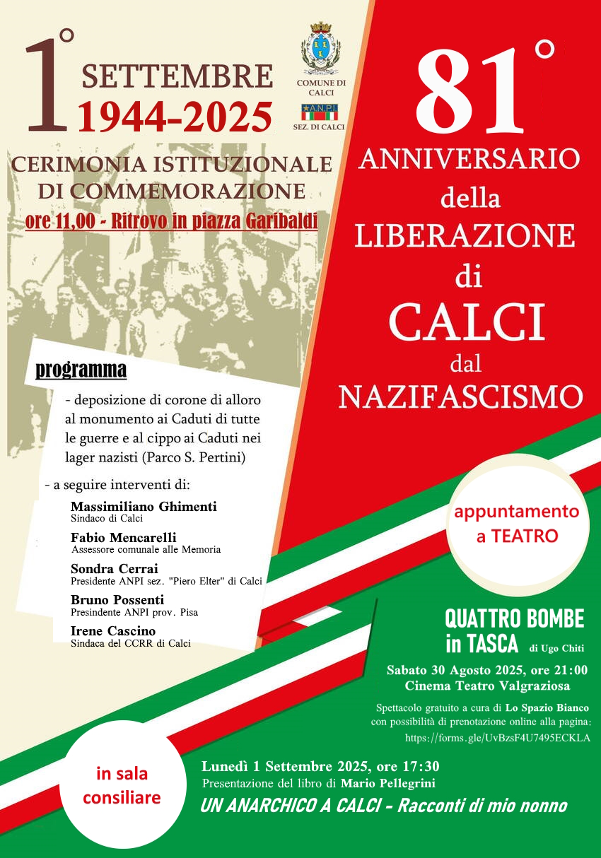 Il 1 Settembre 1944 le truppe alleate oltrepassarono l'Arno, determinando la Liberazione di Calci dal nazifascimo. Nell'81° anniversario di quell'evento, lunedì 1 Settembre 2025 l'amministrazione di Calci ha previsto una cerimonia istituzionale di commemorazione che si svolgerà la mattina, a partire dalle 11, con il ritrovo in piazza Garibaldi per la deposizione di corone di alloro al monumento ai Caduti di tutte le guerre e al cippo ai Caduti nei lager nazisti (Parco S. Pertini). Previsti gli interventi di: Massimiliano Ghimenti, sindaco di Calci; Fabio Mencarelli, assessore comunale alla Memoria, Sondra Cerrai, presidente ANPI sez. Piero Elter di Calci; Bruno Possenti, presidente ANPI prov. di Pisa; Irene Cascino, sindaca del consiglio comunale dei ragazzi e delle ragazze di Calci.