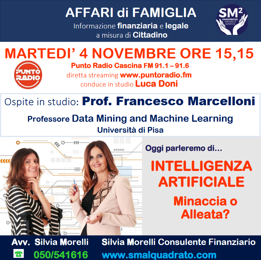 Avremo nuovamente ospite il professore Francesco Marcelloni dell’Università di Pisa, che ci aggiornerà sugli sviluppi scientifici e normativi (AI Act europeo, progetto FAIR).