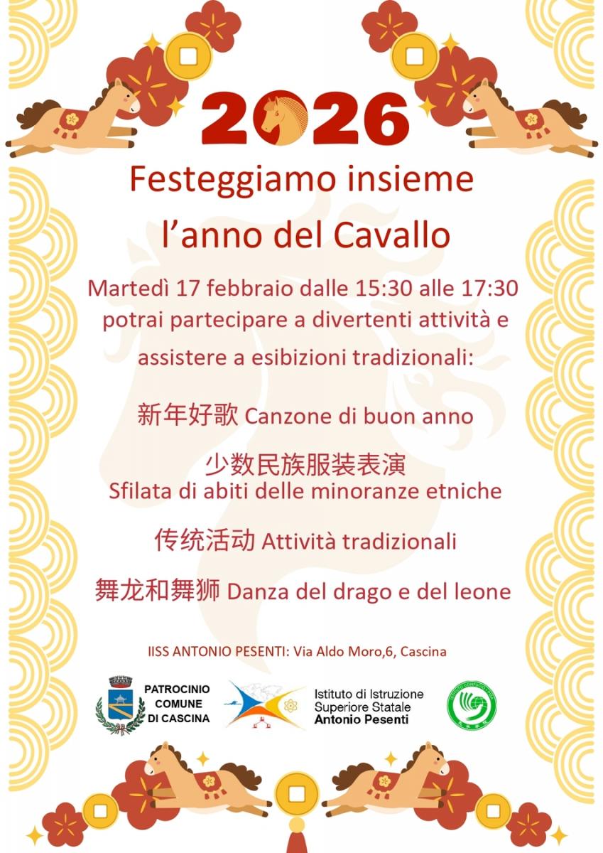 Martedì 17 febbraio, dalle 15.30 alle 17.30, l'Istituto Antonio Pesenti di Cascina invita tutta la cittadinanza ai festeggiamenti per l'Anno Cinese del Cavallo.