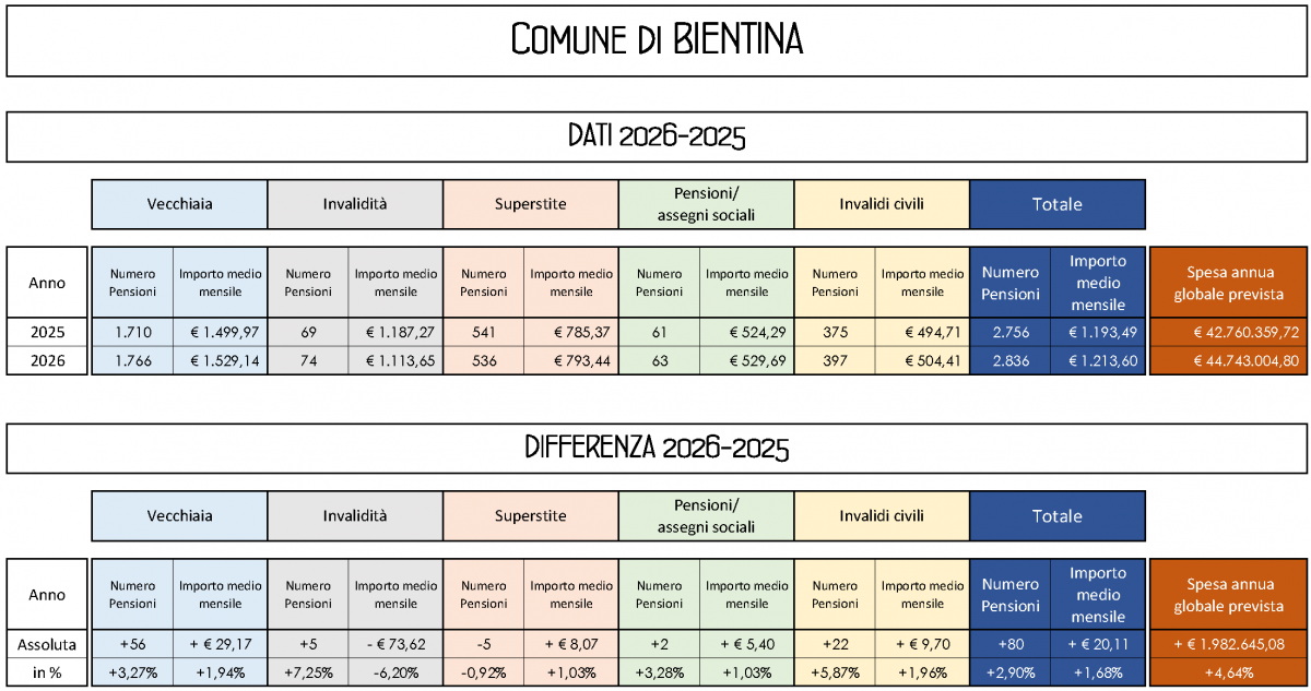 Rispetto al 2025 il numero complessivo delle pensioni cresce, passando da 2.756 a 2.836, con un aumento di 80 unità pari al 2,90%. Aumenta in modo minore l’importo medio mensile, che sale a 1.213,60 euro rispetto ai 1.193,49 euro dell’anno precedente, con una crescita di 20,11 euro (+1,68%).