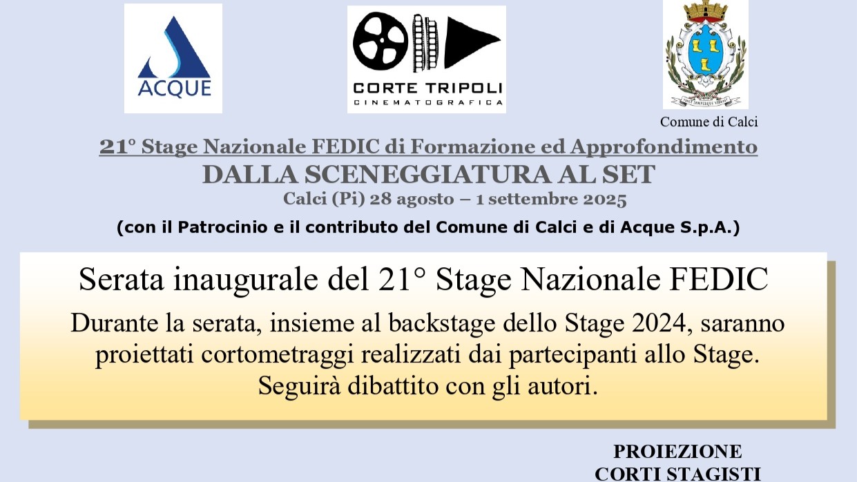 Dal 28 agosto al 1° settembre, infatti, avrà luogo il 21° Stage Nazionale FEDIC di Formazione ed Approfondimento, organizzato da Corte Tripoli Cinematografica APS (Cineclub di Pisa) per conto della FEDIC (Federazione Italiana dei Cineclub).