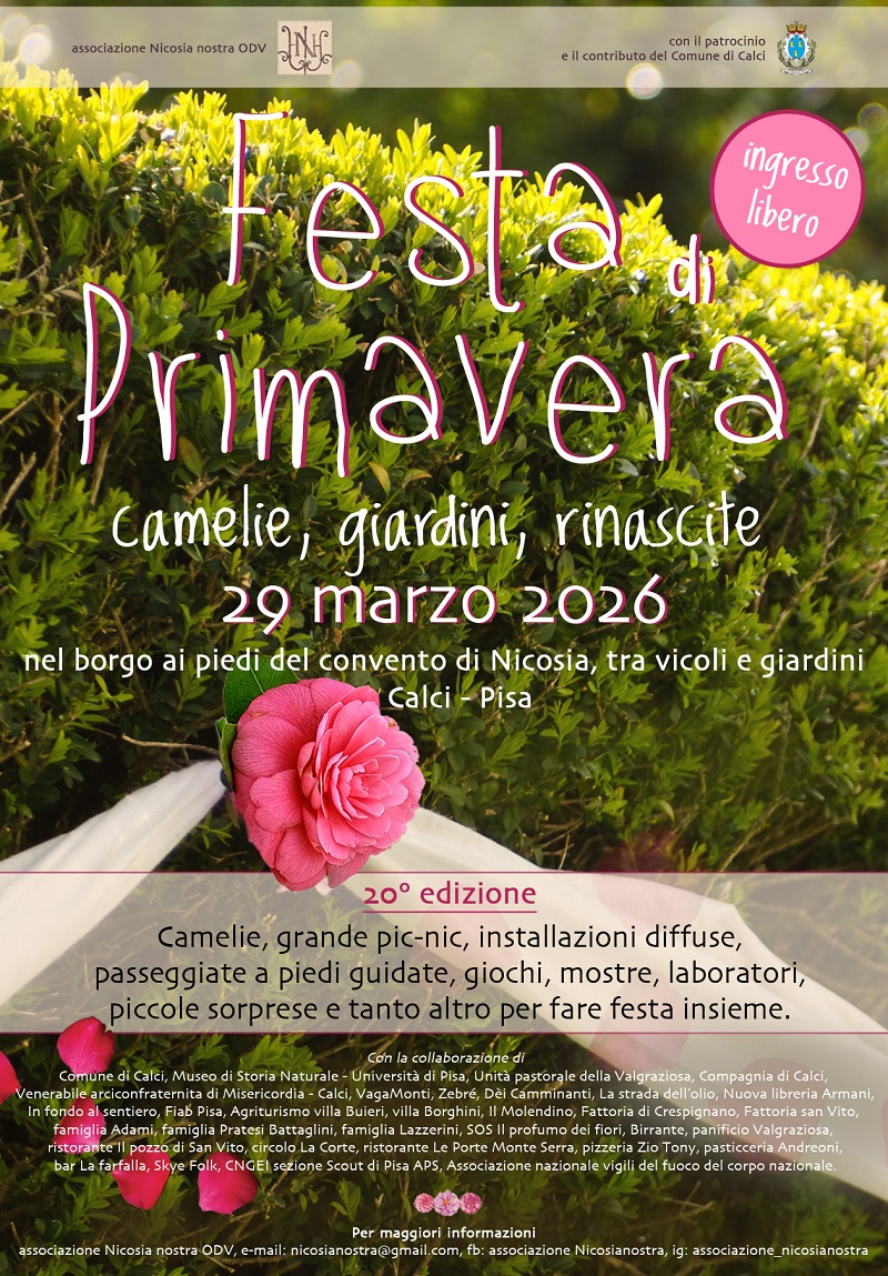 L'evento infatti, dal titolo “Festa di primavera. Camelie, giardini, rinascite”, desidererà dare spazio, oltre alle camelie, anche ai giardini che in primavera si risvegliano e alle rinascite legate alla Natura, al territorio, ai Monti Pisani, alla comunità, al convento di Nicosia.