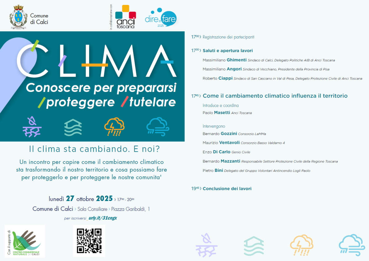 Il Comune di Calci, in collaborazione con Anci Toscana e con il supporto del Centro Commerciale Naturale di Calci, promuove “Clima: conoscere per prepararsi/proteggere/tutelare - Il clima sta cambiando. E noi?”, un incontro per capire come il cambiamento climatico sta trasformando il nostro territorio e cosa possiamo fare per proteggerlo e per proteggere le nostre comunità. L'incontro, gratuito e aperto agli amministratori locali, alle associazioni del territorio e a tutta la cittadinanza, si terrà alle ore 17:00 di lunedì 27 Ottobre 2025 in sala consiliare "Rino Logli" (Comune di Calci). Un appuntamento inserito nel programma di “Dire e fare” 2025, la storica iniziativa organizzata ogni anno da Anci Toscana, in collaborazione con la Regione Toscana, sui temi dell’innovazione e delle buone pratiche della Pubblica Amministrazione.