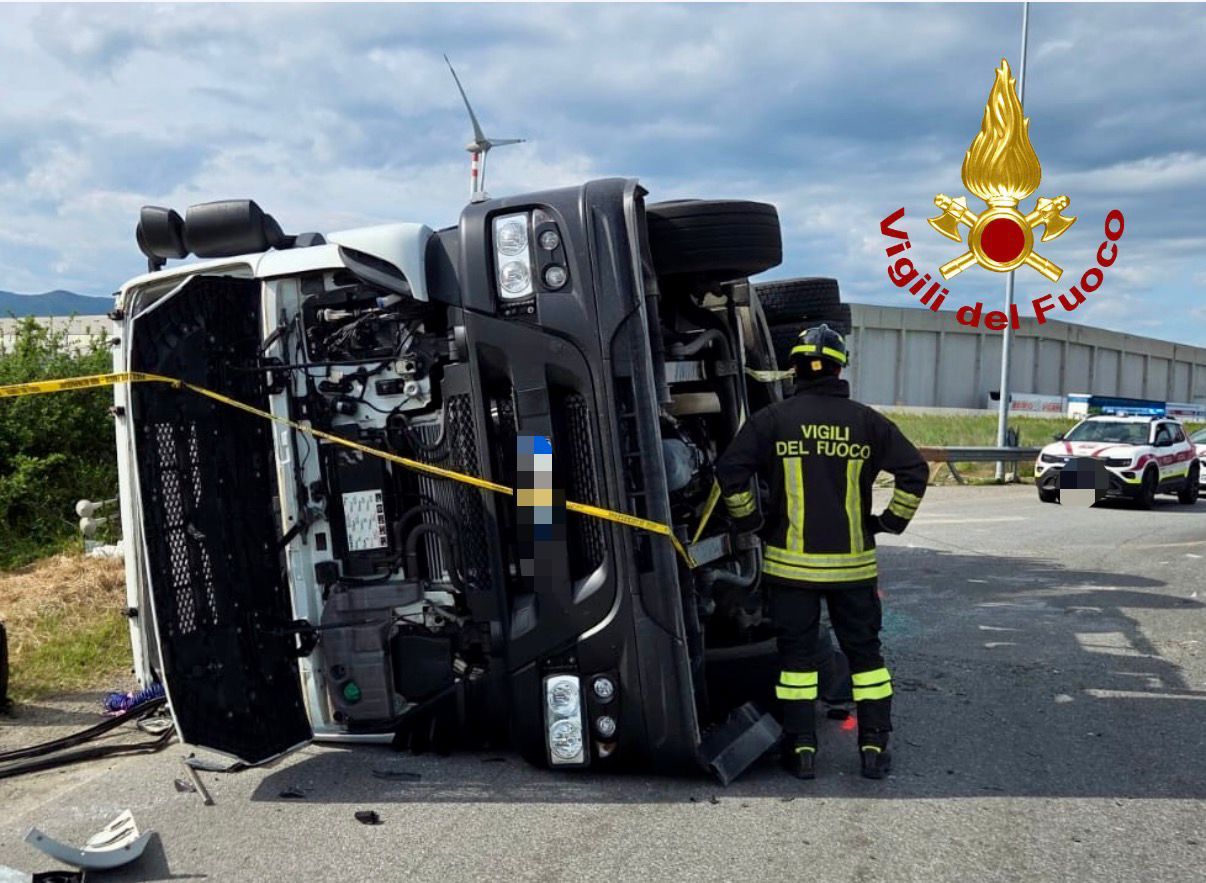 Incidente nel comune di Pontedera: il mezzo pesante è finito fuori strada terminando la corsa al margine della carreggiata. Intervento dei Vigili del Fuoco e del 118