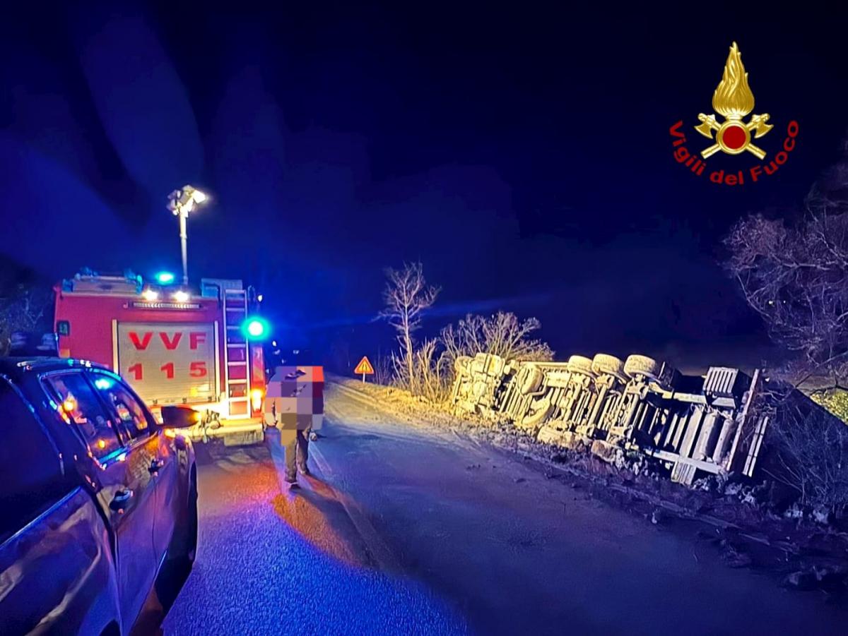 Il mezzo pesante, che trasportava circa 28 tonnellate di sale, è uscito dalla sede stradale per cause attualmente in corso di accertamento. Al momento dell’arrivo della squadra, il conducente era già fuori dalla cabina di guida ed è stato affidato al personale sanitario del 118. Secondo quanto riferito, non avrebbe riportato ferite.