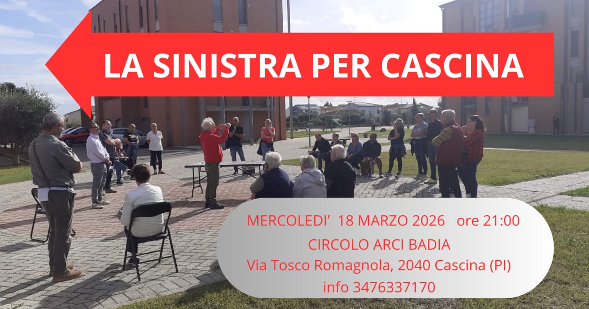 L’appuntamento, dal titolo “La sinistra per Cascina”, è promosso nell’ambito del percorso che alcune componenti della sinistra locale intendono sviluppare dopo l’esperienza politica denominata Toscana Rossa. L’iniziativa si propone come primo momento di dialogo tra partiti, movimenti e singoli cittadini interessati a costruire una proposta politica comune sul territorio.