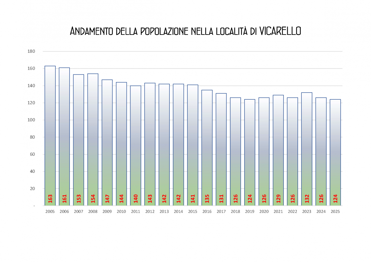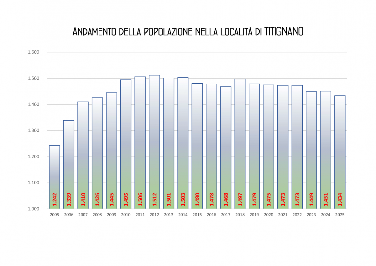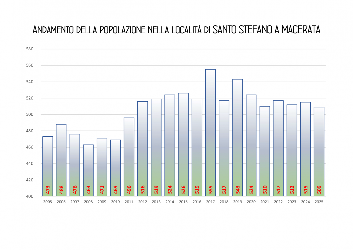 Qui sotto possiamo vedere l’andamento storico della popolazione nelle ultime località: Santo Stefano a Macerata, Titignano, Vicarello, Visignano e Zambra.