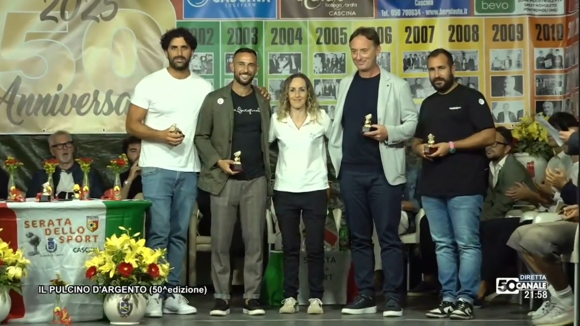 Una serata speciale ha visto Lenergy Pisa BS ricevere il prestigioso 50° Pulcino d’Argento per il merito sportivo, in riconoscimento della vittoria del Campionato di Serie A 2025 di beach soccer. Il premio è stato ritirato in rappresentanza del club dal presidente Alessandro Donati, dal direttore e vicepresidente Andrea Pelli, da mister Matteo Marrucci e da capitan Luca Barsotti.