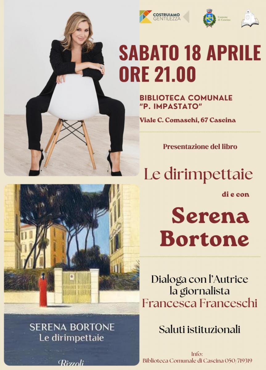 Un nuovo appuntamento culturale dedicato alla narrativa contemporanea è in programma sabato 18 aprile alle ore 21 alla Biblioteca Peppino Impastato di Cascina, dove la giornalista e scrittrice Serena Bortone presenterà il suo ultimo romanzo Le Dirimpettaie, edito da Rizzoli.