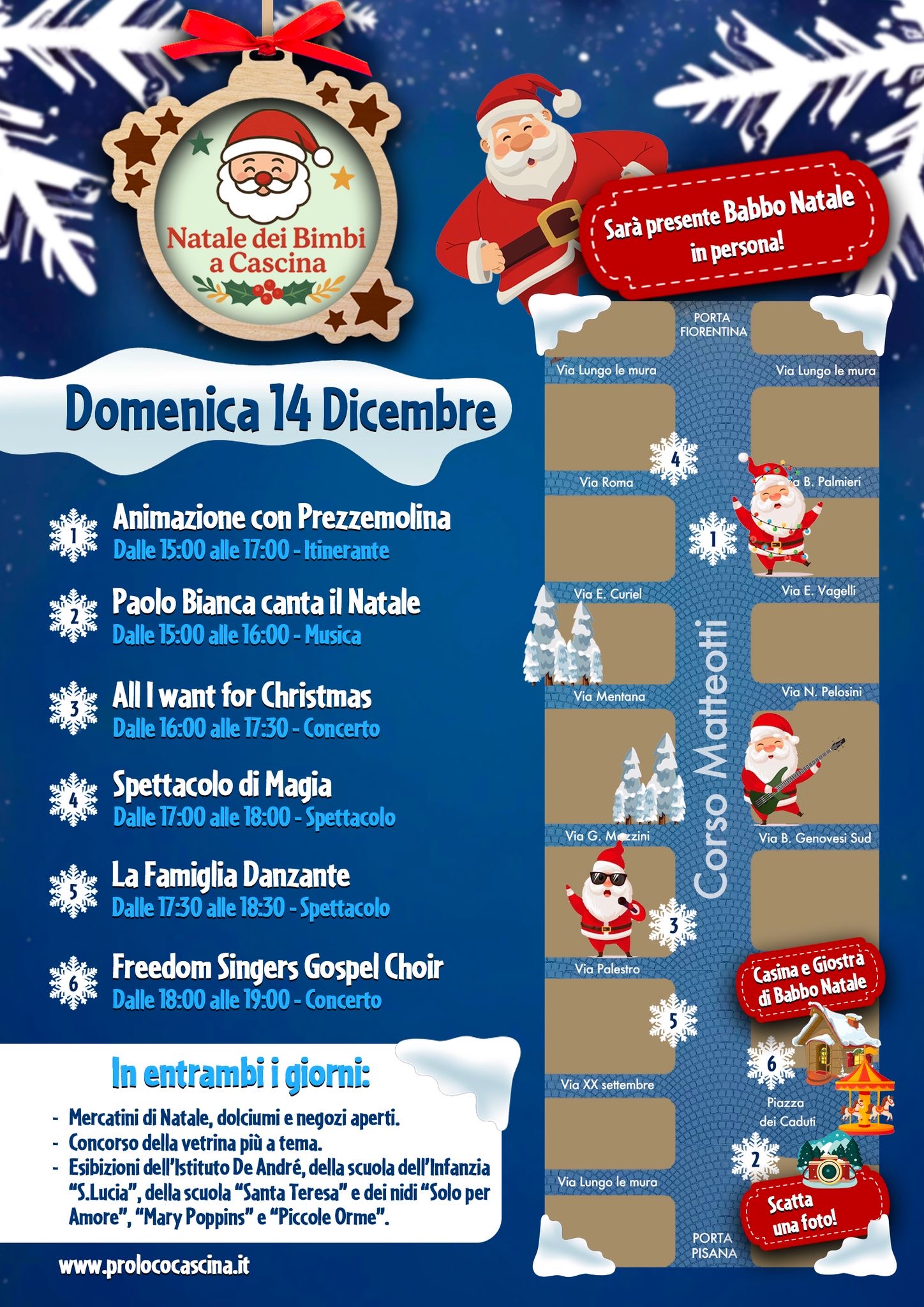 Sempre pensando ai bimbi, l’amministrazione comunale ha previsto anche la collaborazione con le scuole (hanno aderito all’invito l’Istituto De Andrè, le scuole dell’infanzia Santa Lucia e Santa Teresa, i nidi Solo per Amore, Mary Poppins e Piccole Orme, il Liceo artistico Russoli) e l’allestimento in piazza, sotto un tetto di stelle, di una giostra accanto alla tradizionale casina di Babbo Natale. La festa è organizzata dal Comune di Cascina in collaborazione con Pro Loco Cascina, Confcommercio Pisa e Confesercenti Toscana Nord Ovest.