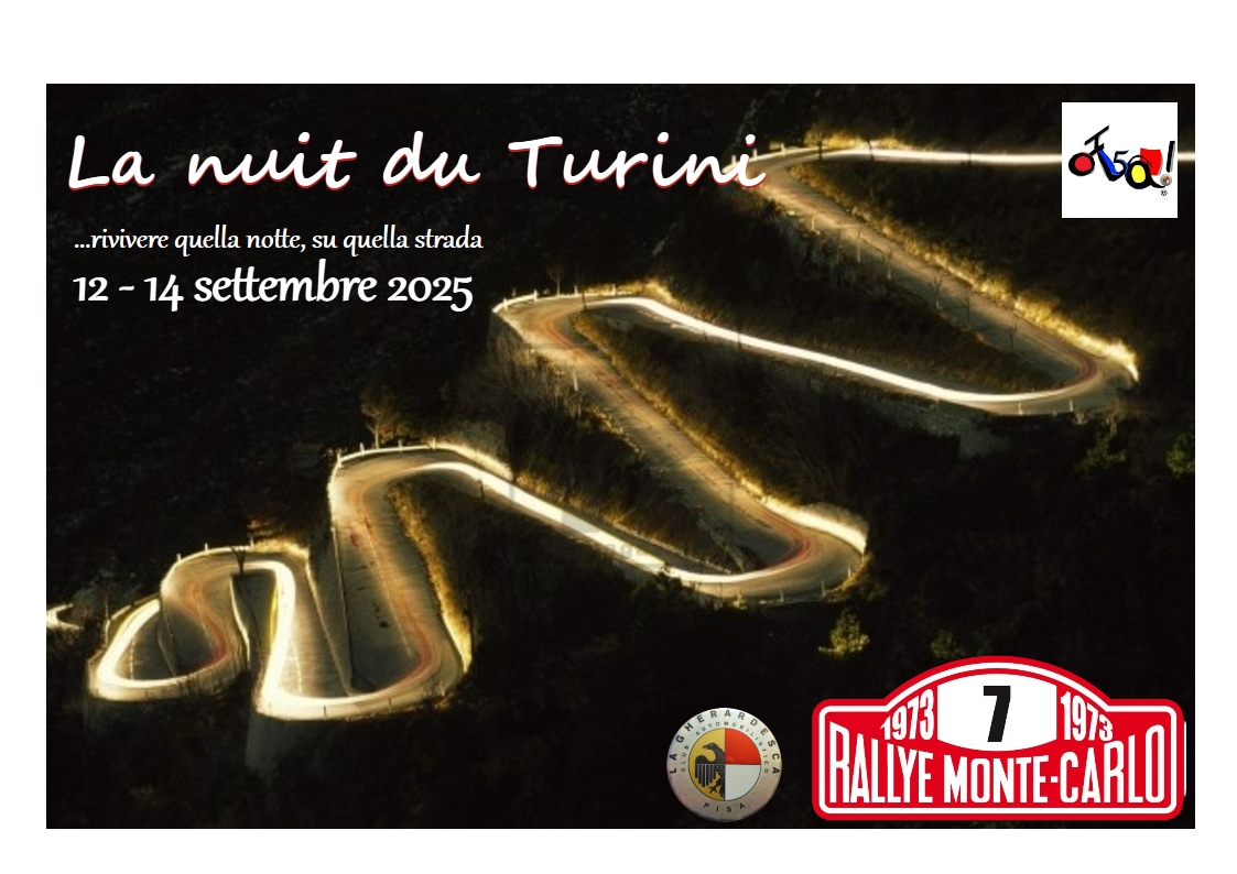 Dal 12 al 14 settembre il Club Automobilistico “La Gherardesca” - dopo il viaggio lungo la statale 12 a maggio - riproporrà un altro evento rievocativo dell’automobilismo che fu, ma di impronta più sportiva: “La Nuit du Turini”, ispirata al Rally di Montecarlo, inizierà con la simulazione del percorso di concentrazione del 1973, e partirà dal Santuario della Madonna dell’Acqua a Cascina (Pisa) venerdì, dopo la benedizione delle auto e il saluto del sindaco. Come allora il percorso si snoderà esclusivamente sulla statale Aurelia, con sosta serale a Savona per una serata sempre a tema rally con ospiti illustri. Il sabato, percorsa la Riviera di Ponente, le auto si dirigeranno nell’entroterra francese per affrontare la prova del Turini, momento chiave di tutte le edizioni del rally.