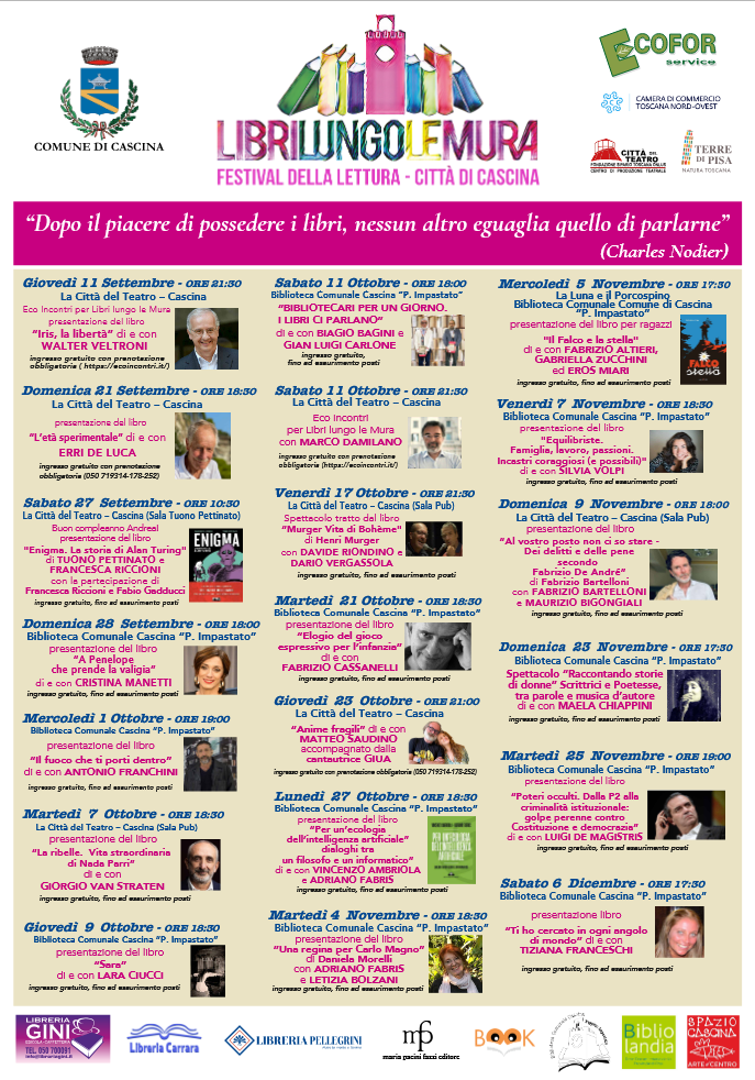 Giunge alla terza edizione “Libri lungo le mura - Festival della lettura Città di Cascina”, istituito dall’amministrazione comunale di Cascina e che porterà in città tantissimi appuntamenti dalla prossima settimana fino a dicembre. “Questa serie di incontri – ha detto il sindaco Michelangelo Betti – dimostra che l’amministrazione lavora per avere un’offerta culturale sui 12 mesi: non ci si ferma all’estate, ma si va avanti fino a inizio dicembre. Con questo calendario si attraversa tutto l’autunno, con nomi molto vari e differenziati per incontrare i gusti di tutti. Importante anche la collaborazione con Ecofor, perché ci consente di avere eventi che hanno la necessità di essere ospitati nella sala grande della Città del Teatro. Rispetto alla prima edizione, in cui gli spazi erano giocati su una capienza più ridotta, ora si approda anche nella sala da 700 posti, con un ruolo che va anche oltre i confini comunali”.