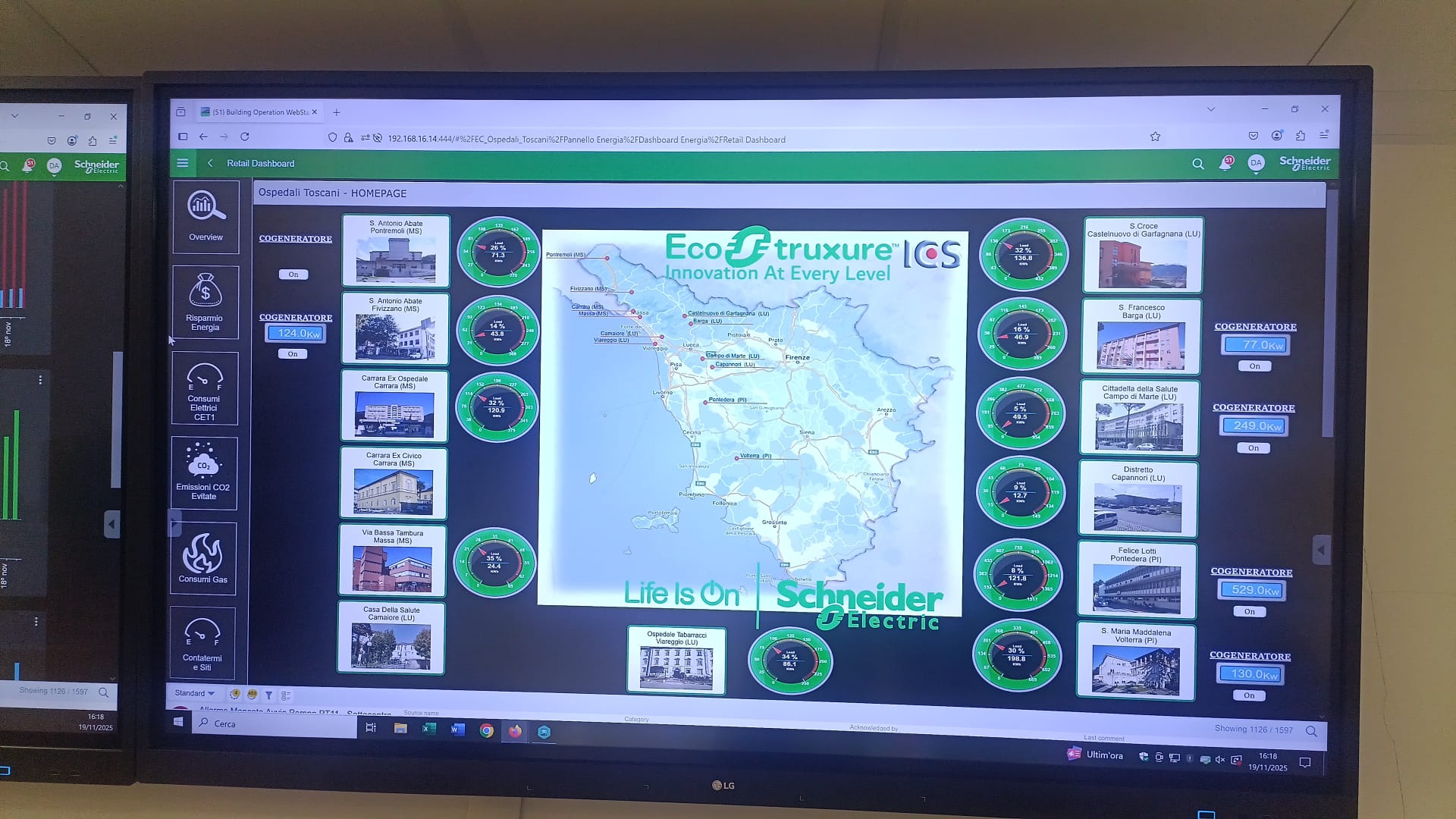 In questi 13 presidi è stato installato un sistema di supervisione (Building management system – BMS) che gestisce e monitora le apparecchiature meccaniche ed elettriche degli edifici e convoglia i dati nella moderna control room realizzata all’interno ospedale Versilia.