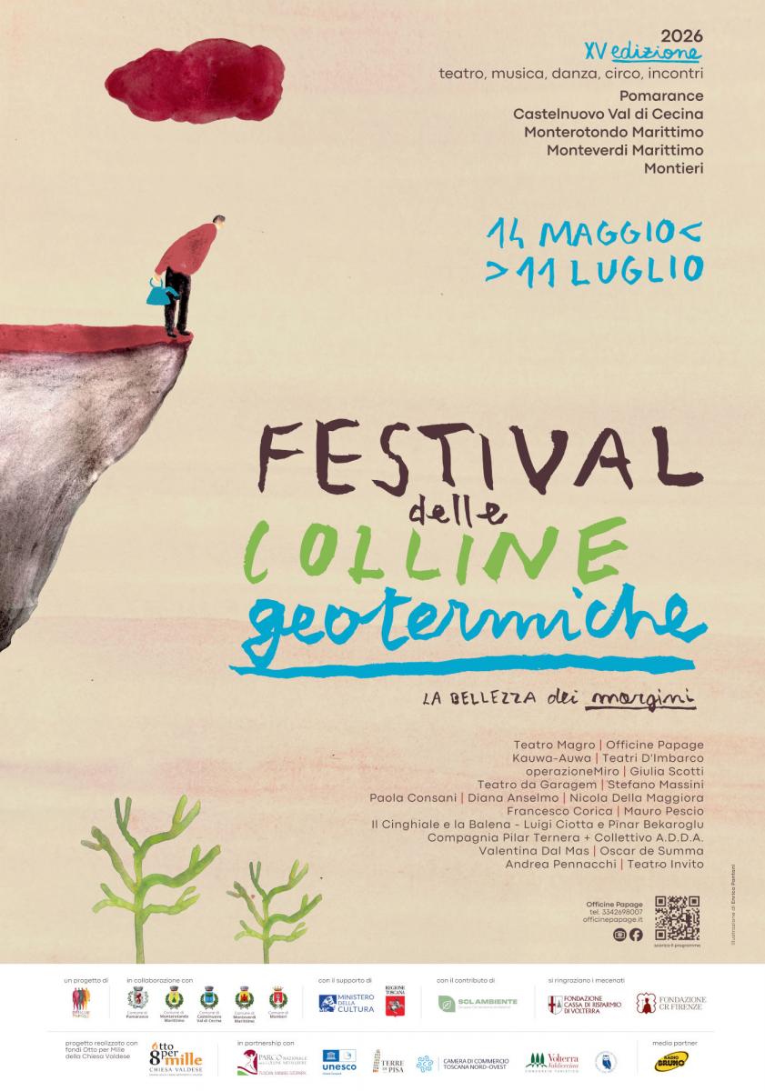 Il Festival delle Colline Geotermiche è un progetto di Officine Papage. In collaborazione con Comune di Pomarance, Comune di Monterotondo Marittimo, Comune di Castelnuovo Val di Cecina, Comune di Monteverdi Marittimo, Comune di Montieri. Con il supporto di MIC - Ministero della Cultura, Regione Toscana. Con il contributo di Enel, SCL Ambiente. Si ringraziano i mecenati Fondazione Cassa di Risparmio di Volterra, Fondazione Cassa di Risparmio di Firenze. Progetto realizzato con fondi Otto per Mille della Chiesa Valdese. In partnership con Parco Nazionale delle Colline Metallifere UNESCO Global Geopark, Terre di Pisa, Camera di Commercio Toscana Nord – Ovest, Volterra Valdicecina Consorzio Turistico, Dipartimento di Civiltà e Forme del Sapere – Università di Pisa. Media partner Radio Bruno.
