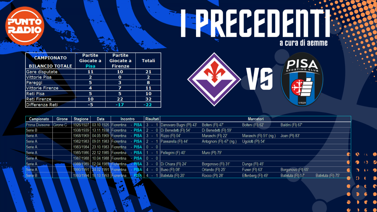 In terra fiorentina non è mai andata granchè bene. 10 i precedenti senza vittorie con soli tre pareggi e ben sette sconfitte. L'ultima volta che il Pisa è uscito non a mani vuote è stato nel 1988, 0-0 il punteggio. negli ultimi tre confronti ben 11 reti subote a fronte di solo una segnata.
