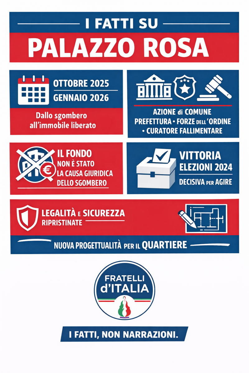 I fatti dicono anche altro: per anni Palazzo Rosa è rimasto irrisolto. Solo dopo la vittoria alle elezioni amministrative del 2024, alla quale il contributo elettorale di Fratelli d’Italia è stato determinante, è stato possibile imprimere una linea politica chiara e coerente che ha reso concretamente praticabile l’intervento.