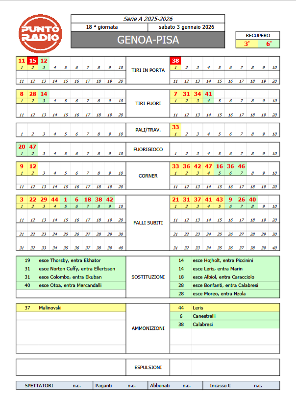 Buonasera, tutto pronto per Genoa-Pisa, match valido per la 18a giornata di serie A. Squadre in campo, Pisa in maglia gialla. Un minuto di silenzio per le vittime di Crans-Montana, in Svizzera. Partiti! Ci prova il Pisa al 7': Leris, dal limite, incrocia fuori di poco. Premono i padroni di casa. Angolo Genoa al 10', risolve Semper in presa alta. Occasione Genoa: Vitinha impegna Semper al 12', che si rifugia in calcio d'angolo. Gol Genoa al 15': Colombo fa tutto da solo, riceve al limite e con un tocco di prima si libera al tiro, conclusione secca sul secondo palo e 1 a 0. Accade poco, gioco spezzettato. Partita di nervi e molta sostanza che il Genoa conduce da dieci minuti. Siamo al 26': Pisa ancora incapace di riprendere posizione nella metà campo avversaria. Destro alto sopra la traversa da posizione defilata di Frendrup al 28'. Punizione Pisa da buona posizione al 30': sul punto, dal vertice destro dell'area genoana, Aebischer e Angori. Batte Angori, tiene la difesa di casa. Occasionissima Pisa al 33': traversa di Leris, sul tocco d'istinto di leali, che salva il Genoa e mette in angolo. Bella ripartenza nerazzurra a sinistra, palla che da Angori arriva all'algerino che di testa, a colpo sicuro, trova la paratona del portiere. Ancora Pisa al 35' e nuovo angolo: da destra va Leris al 36'. Meister tiene palla al 37', conquista punizione dalla trequarti, ammonito Malinovskyi. Goooollllll Pisa al 38': sulla punizione da sinistra, palla che in qualche modo arriva a Leris e gol del pareggio. Resta a terra il portiere di casa, travolto in uscita da un compagno. Gol che appare regolare. Confermato, si riparte al 40' dall'1 a 1. I nerazzurri dopo un inizio molto difficile, da circa 5 minuti spingevano con più regolarità e subito è arrivato il pareggio di Leris (dopo la traversa al 33'), al momento tra i migliori in campo. Corner nerazzurro al 42': da sinistra va Leris per un nulla di fatto. Ancora Pisa al 43', ora Genoa in difficoltà. Partita che torna aperta. Ammonito Leris al 44'. 3 minuti di recupero. Al 46' quarto tiro dalla bandierina per il Pisa: da sinistra Angori che spreca. Finisce così, squadre al riposo sul pareggio.