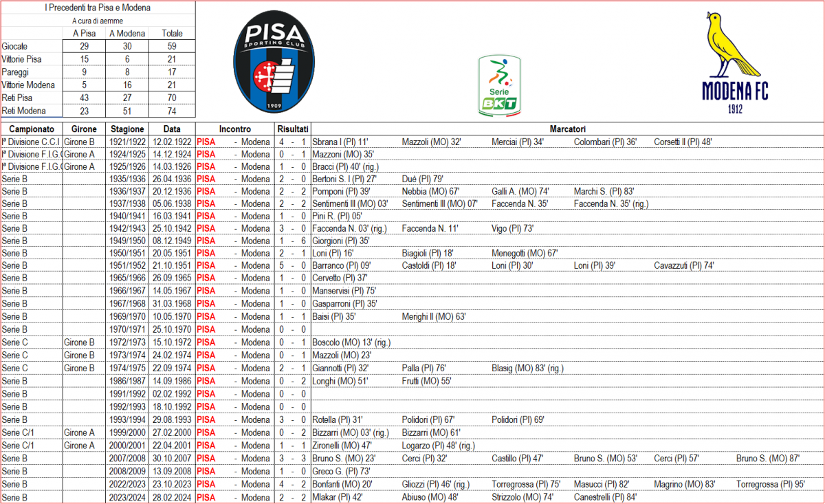 I PRECEDENTI Ventinove sono i precedenti all’Arena fra le due squadre, partite che narrano la storia di gare sempre molto combattute e ricche di reti. Il bilancio vede il Pisa a quota 15 vittorie, l’ultima 4-2 nell’ottobre 2023, 8 pareggi, compreso il 2-2 dello scorso anno, e 5 sconfitte, per trovarne l’ultima bisogna risalire ad inizio secolo, quanto il 27 febbraio 2000 i canarini vinsero 2-0 con doppietta di Bizzarri.