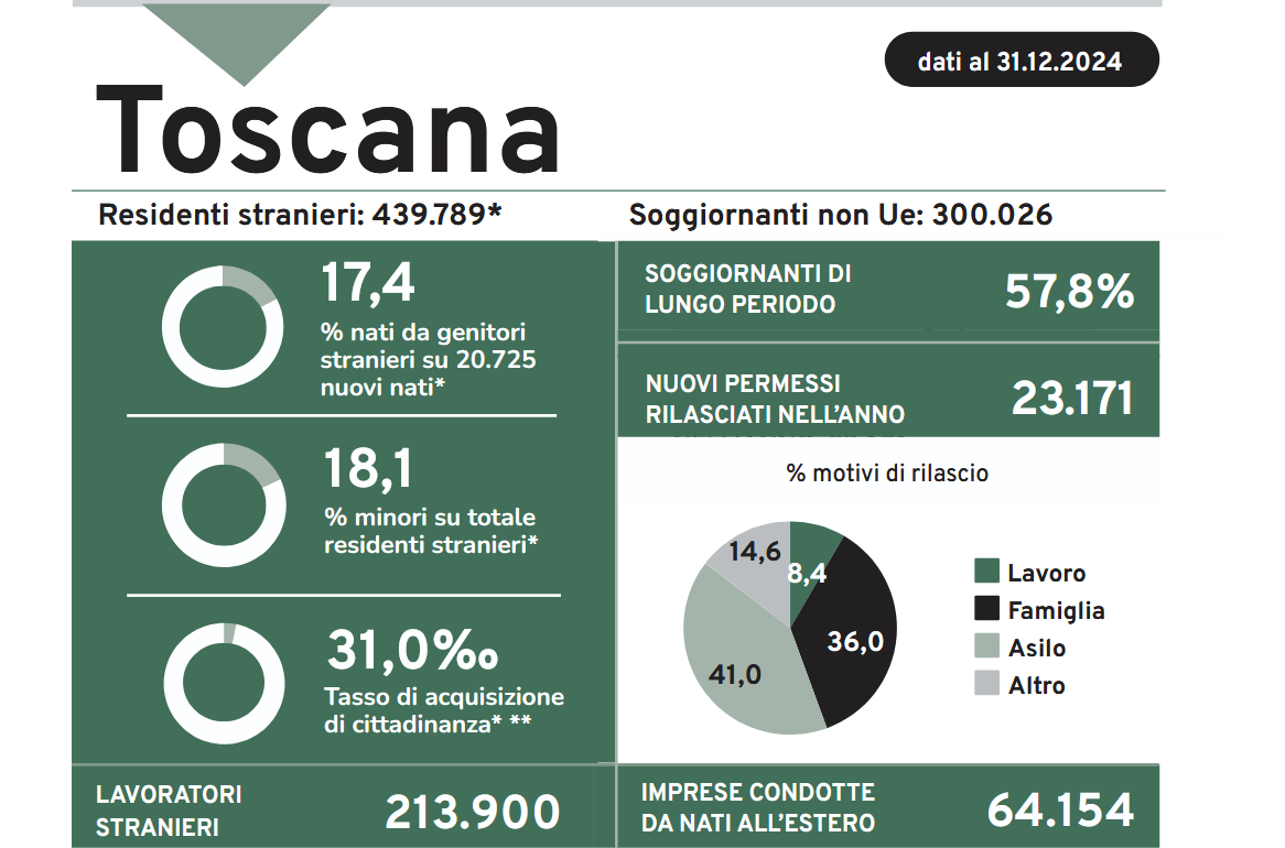 L’immigrazione in Toscana torna a crescere: nel 2024 gli stranieri residenti sono 439.789, con un incremento del 3,7% rispetto all’anno precedente.