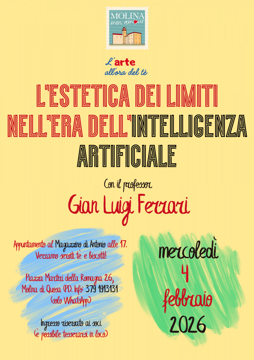 Si chiude con un incontro su arte e intelligenza artificiale, a cura del professor Gian Luigi Ferrari, la rassegna "L'arte all'ora del tè" di Molina mon amour per la stagione 2025/2026, il 4 febbraio, alle 17, al Magazzino di Antonio