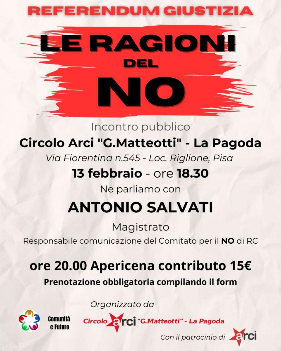 L’iniziativa, organizzata dal Circolo Arci Matteotti e dall’associazione Comunità e Futuro, prevede la partecipazione del magistrato Antonio Salvati, che illustrerà le ragioni del “No” alla modifica costituzionale, analizzando le implicazioni istituzionali e il dibattito sulla separazione delle carriere tra magistrati e procuratori.