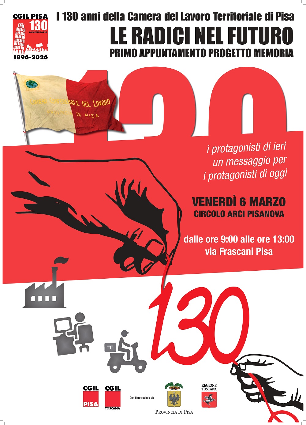Nel 2026 ricorrono i 130 anni dalla nascita della Camera del Lavoro territoriale di Pisa (1896–2026), da cui prese forma l’esperienza sindacale che avrebbe poi contribuito alla costruzione della CGIL nel nostro territorio