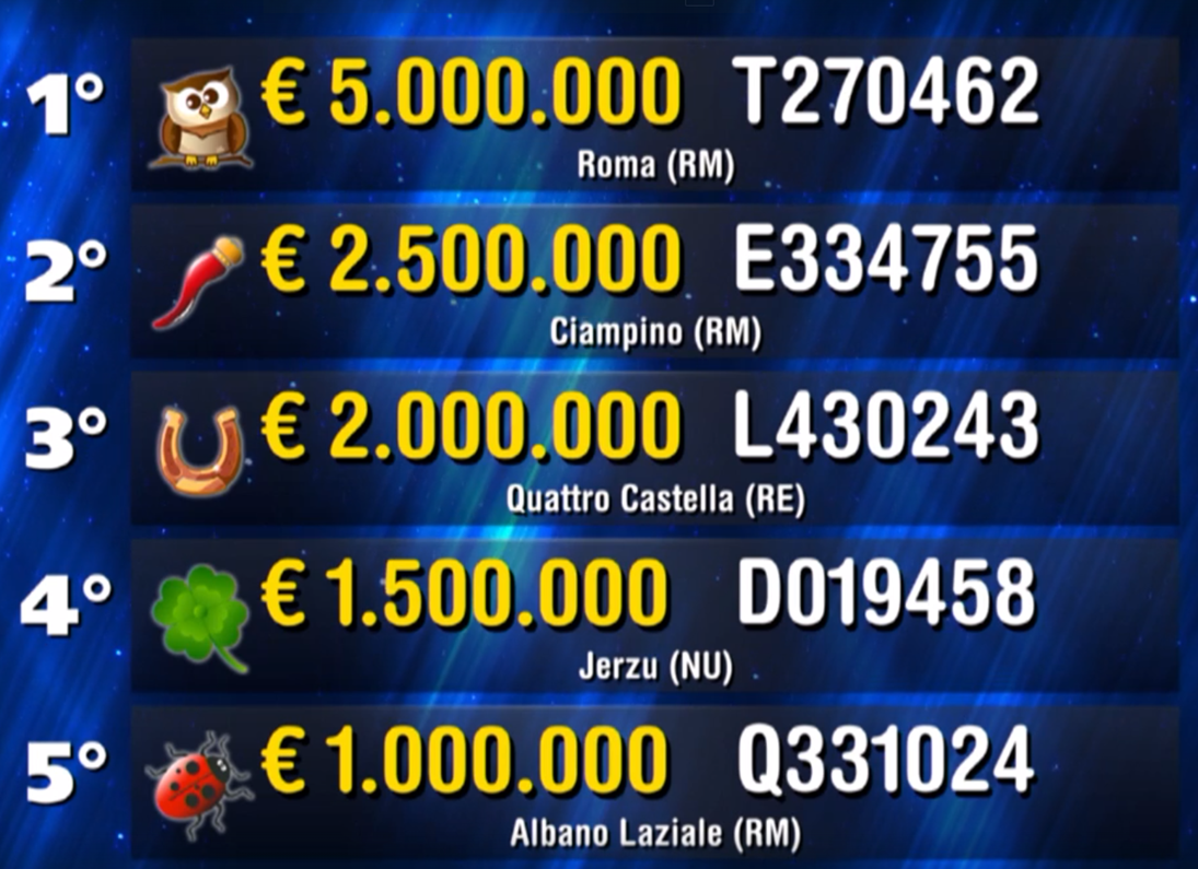 Il terzo premio da 2 milioni di euro vola invece in Emilia-Romagna, a Quattro Castella, nel Reggiano. Il quarto premio, del valore di 1,5 milioni di euro, è stato centrato a Jerzu, in provincia di Nuoro, mentre il quinto premio da 1 milione di euro è stato venduto ad Albano Laziale.