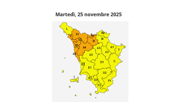 Dalla serata di oggi, ma soprattutto nella giornata di domani martedì 25 novembre, sono attese piogge anche molto abbondanti specie sul versante nord ovest., in Lunigiana, nell’alto livornese e alto pisano.