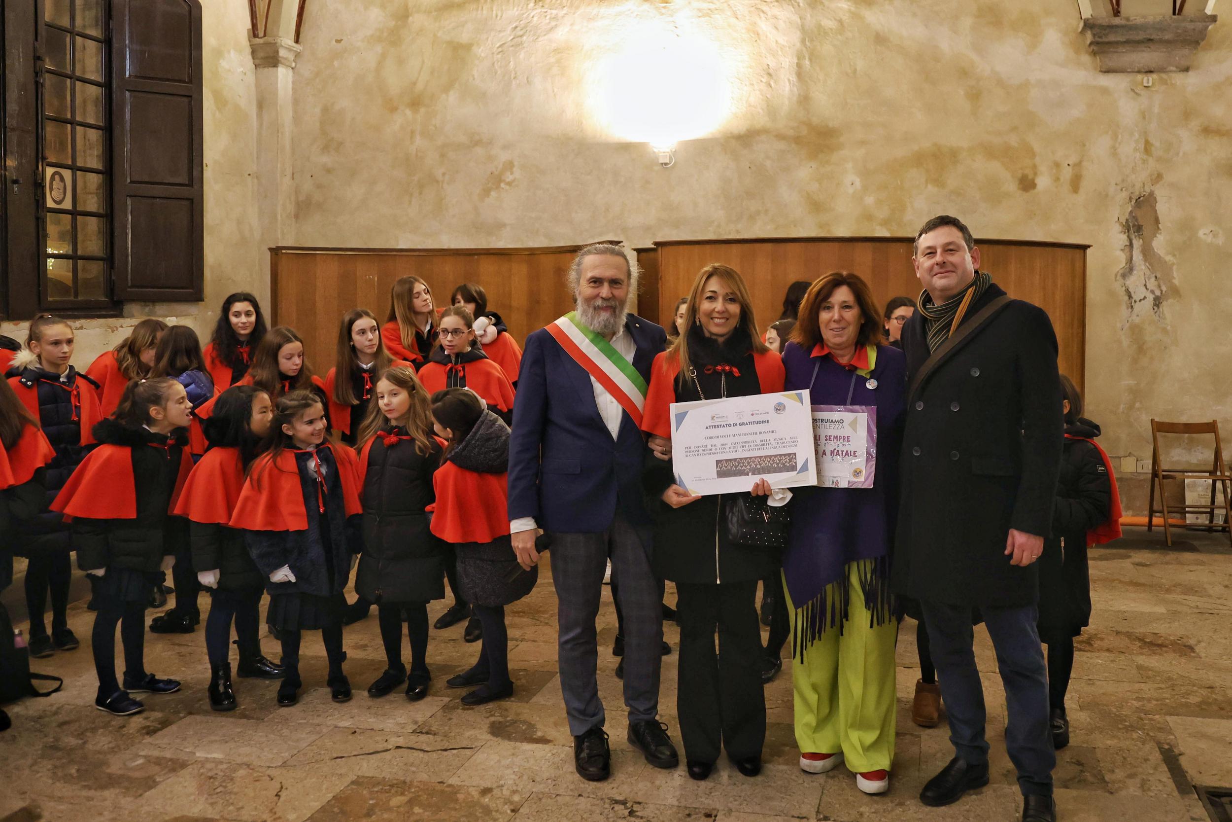 Con la tradizionale cerimonia allietata dai canti delle voci bianche del coro “G. Bonamici” è stato inaugurato il presepe allestito a palazzo Gambacorti, sede del Comune di Pisa. alla presenza dell’assessore Riccardo Buscemi e di padre Paolo Guerrini, parroco del Comune, i bambini hanno cantato durante l’accensione del presepe e la deposizione di Gesù Bambino nella culla da parte del piccolo Francesco Paolo. Nell’occasione, l’ambasciatrice di “Costruiamo Gentilezza”, Germana delle Canne, ha consegnato ad Angelica Di Taranto e al coro da lei diretto un’attestazione per avere reso “accessibile” la musica anche ai non udenti grazie all’utilizzo del linguaggio LIS durante le esecuzioni.
