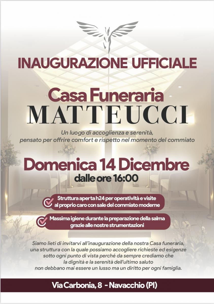 Sarà inaugurata domenica 14 dicembre a Navacchio, in via Carbonia 8, la nuova Casa Funeraria Matteucci.