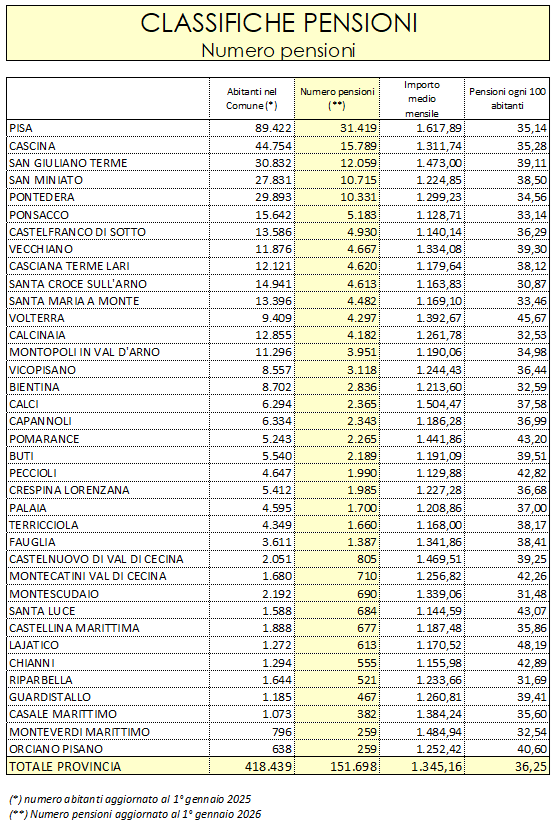 All’estremo opposto della classifica si trovano invece i centri più piccoli: Orciano Pisano e Monteverdi Marittimo si fermano a 259 pensioni, seguiti da Casale Marittimo (382) e Guardistallo (467), tutti sotto la soglia delle cinquecento.