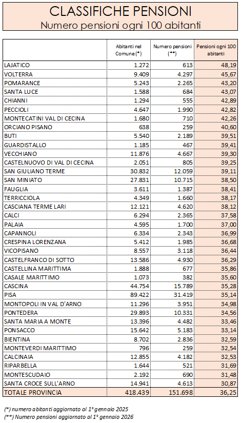 In tutta la provincia si registrano 36,25 pensioni ogni 100 abitanti (151.698 pensioni su 418.439 residenti). A livello comunale, il valore più alto si registra a Lajatico, dove si contano 48,19 pensioni ogni 100 abitanti (613 pensioni su 1.272 residenti). Sul podio anche Volterra (45,67) e Pomarance (43,20), territori dove il peso della popolazione anziana incide in modo significativo.