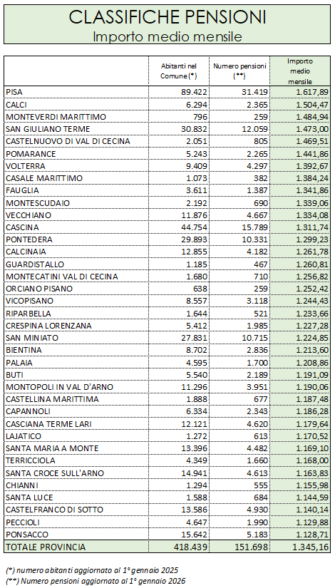 Infine, lo sguardo si sposta sugli importi. Il comune con le pensioni medie più alte è ancora Pisa, con un assegno mensile di 1.617,89 euro. Seguono Calci (1.504,47 euro) e Monteverdi Marittimo (1.484,94 euro).