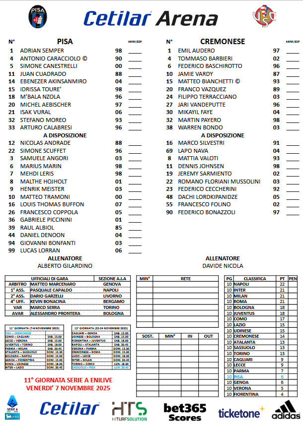 PISA SC (3-5-2): Semper; Calabresi, Caracciolo, Canestrelli; Touré, Vural (22' st Piccinini), Aebischer, Akinsanmiro (22' st Marin), Cuadrado (1' st Leris); Moreo (22' st Tramoni), Nzola (46' st Meister). A dis. Nicolas, Scuffet, Angori, Hojholt, Buffon, Coppola, Albiol, Denoon, Bonfanti, Lorran. All. Gilardino.