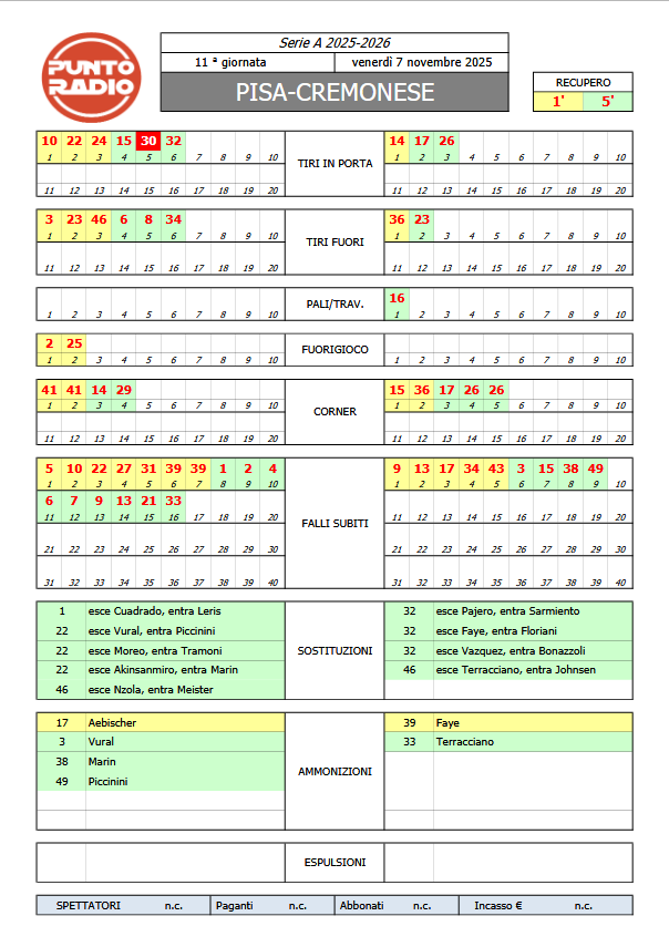 Buonasera, tutto pronto per Pisa-Cremonese, match valido per l'11a giornata di serie A. Squadre in campo, Pisa in maglia nerazzurra e che attaccherà sotto la Curva Sud. Partiti! Occasione Pisa al 3': Akinsanmiro da sinistra mette in mezzo, tocca un difensore e Touré, sul secondo palo e da posizione defilata, calcia fuori di poco. Pericolosi anche gli ospiti al 5'. Match equilibrato e giocato a viso aperto da entrambe le squadre. Ci prova Nzola dalla lunga all'11', conclusione di facile presa per Audero. Buon Pisa anche al 13', la difesa ospite si salva in extremis sul cross basso da destra di Tourè. Riparte la Cremonese che va al tiro e trova la risposta in corner di Semper. Siamo al 16'. Ammonito Aebischer al 17' per un fallo in mediana su Bondo. Al 22' punizione interessante dalla trequarti sinistra Pisa (conquistata da Cuadrado): sul punto Cuadrado, di testa schiaccia Caracciolo debole. Para Audero. Ancora Pisa al 23': Cuadrado da sinistra mette sul secondo palo una bella palla tagliata e Touré arriva in ritardo di testa. Akinsanmiro da fuori al 24', para a terra Audero. Dopo 25 minuti di gara, Pisa che spinge sull'acceleratore e che prova a fare la partita. Gol Pisa al 26': Akinsanmiro vede e serve in verticale Nzola, che salta il portiere e mette in porta. Rete annullata per fuorigioco. Peccato. Alla mezz'ora, buon Pisa sempre proiettato in avanti, la Cremonese tiene senza troppo soffrire e mettendo in campo molta cattiveria agonistica. Ora preme la Cremonese che al 32' va al tiro tre volte consecutive trovando sempre la risposta del muro nerazzurro. Angolo Cremonese al 36': palla che arriva a Vazquez che spara in Curva. Ammonito Faye al 39' per un fallo su Touré. Batte Cuadrado al 40', Touré sul secondo palo mette in mezzo e palla deviata in corner, il primo del match per i nerazzurri. Batte Cuadrado al 41' e palla ancora in angolo. Sul secondo tentativo da sinistra risolve Audero in presa alta. Al 43' punizione da posizione pericolosa Cremonese, l'azione prosegue e la difesa nerazzurra salva in extremis. Partita che resta apertissima. Siamo al 44'. 1 minuto di recupero. Finisce così, squadre al riposo sullo 0 a 0.