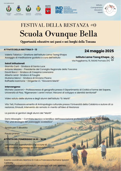 L’Istituto comprensivo Giovanni Mariti, unitamente ai Comuni nei quali è articolato - Crespina Lorenzana, Fauglia, Orciano Pisano, Santa Luce, con il patrocinio di Regione Toscana, ANCI Toscana e INDIRE - desidera avviare una riflessione in merito alle opportunità e alle difficoltà che incontra la scuola che abbia sede in località periferiche, realizzando il primo festival della Restanza, nel quadro suggestivo dell’Istituto Lama Tzong Khapa di Pomaia, nel comune di Santa Luce.