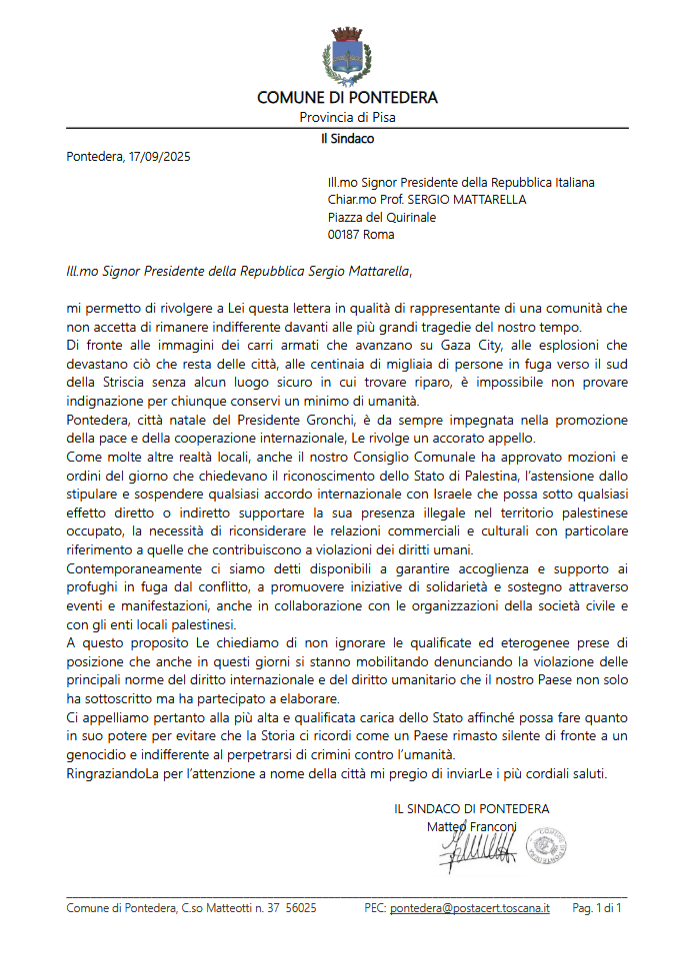Nella lettera a Mattarella c'è un riferimento diretto a "Pontedera, città natale del Presidente Gronchi, da sempre impegnata nella promozione della pace e della cooperazione internazionale" e al lavoro svolto dal Consiglio Comunale che "Ha approvato mozioni e ordini del giorno che chiedevano il riconoscimento dello Stato di Palestina, l’astensione dallo stipulare e sospendere qualsiasi accordo internazionale con Israele che possa sotto qualsiasi effetto diretto o indiretto supportare la sua presenza illegale nel territorio palestinese occupato, la necessità di riconsiderare le relazioni commerciali e culturali con particolare riferimento a quelle che contribuiscono a violazioni dei diritti umani".