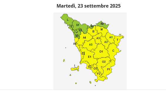 La Sala operativa della Protezione civile regionale ha emesso pertanto un avviso di criticità gialla per rischio idrogeologico e idraulico del reticolo minore e per temporali forti che sarà in vigore fino alla mezzanotte di lunedì 22 settembre sul nord della Toscana e fino alle 17 di martedì 23 settembre, sul resto della regione.