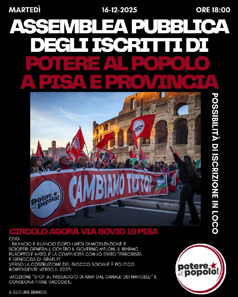Convochiamo l'assemblea degli iscritti e delle iscritte di Potere al Popolo a Pisa e provincia per fare un bilancio dopo intensi mesi di lavoro politico e sociale! Mesi in cui anche nel nostro territorio siamo stati in prima linea nella costruzione delle mobilitazioni che hanno affiancato gli scioperi generali di USB e del sindacalismo di classe del 22 settembre, del 3 ottobre e del 28 novembre, fino alla grande manifestazione nazionale del 29 novembre contro il governo Meloni e la finanziaria di guerra!