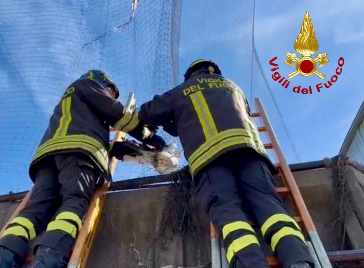 «Il personale intervenuto ha operato con la massima cautela per evitare ulteriori stress all'animale», spiegano dal comando provinciale. I vigili del fuoco sono riusciti a tagliare i filamenti della rete che tenevano bloccate le ali del gabbiano, completando l'operazione in pochi minuti e mettendo contestualmente in sicurezza l'area interessata.