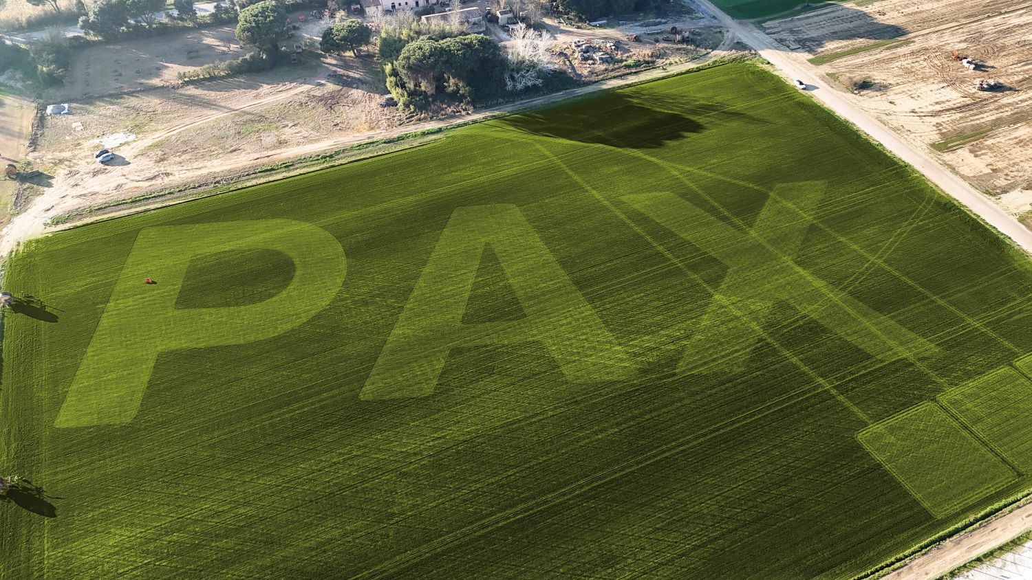 Nella campagna di San Piero a Grado, alle porte di Pisa, un’area di circa tre ettari di tappeto erboso è stata trasformata in una grande tavolozza naturale per la realizzazione di una scritta a forte valore simbolico. La parola latina PAX, estesa per circa 180 metri e visibile anche dagli aeromobili in fase di atterraggio presso l’aeroporto “Galileo Galilei”, campeggia nel paesaggio agrario come messaggio universale di pace, equilibrio e armonia.