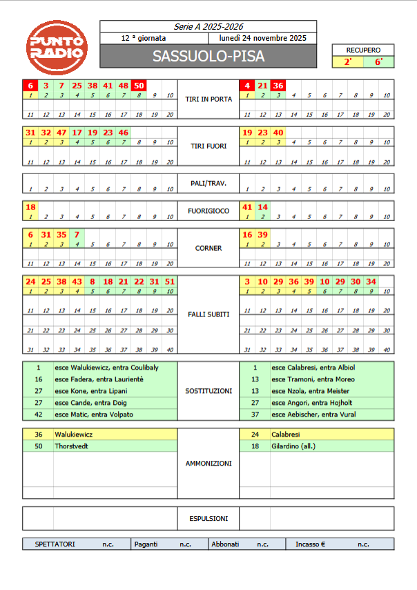 Buonasera, tutto pronto per Sassuolo-Pisa, match valido per la 12a giornata di serie A. Pisa in maglia bianca. Giocatori in campo con un segno rosso sul volto, per la Giornata mondiale contro la violenza sulle donne del 25 novembre. Partiti! 5 secondi e fallo su Touré in area. Controllo Var in corso. L'arbitro va a rivedere il fallo. Rigore per il Pisa. Fallo di Candé. Siamo al 3', sul dischetto va Nzola. Goolllllll al 4', 1-0 Pisa. Aleeeeee. Angolo Sassuolo al 6': da destra va Berardi corto, l'azione prosegue e alla fine, sulla ribattuta della difesa nerazzurra Matic fissa in semirovesciata l'1 a 1. Controllo Var in corso per possibile fuorigioco. Tutto regolare, si riparte all'8' sul pareggio. Raggiunto e superato il quarto d'ora e Pisa in pressione, padroni di casa che tengono botta in difficoltà. Angolo per i nerazzurri al 16'. Da sinistra va Angori e Caracciolo in anticipo mette di molto sul fondo. Ottimo avvio per la squadra di Gilardino, al momento sempre prima sulle seconde palle. Siamo al 18'. Occasione sprecata da Tramoni al 20', su assit al bacio di Leris da sinistra. Destro di prima intenzione storpiato sul fondo da ottima posizione. Anche questa volta il Pisa aveva ben riconquistato il possesso in mediana per ripartire. Occasione sprecata da Tramoni al 23': destro di prima intenzione al volo da dentro l'area, sull'ottima iniziativa da sinistra dei nerazzurri. Palla altissima sopra la traversa. Peccato. Ammonito Calabresi al 25' per un fallo in ritardo in mediana. Ci provano ora i padroni di casa. Siamo al 27'. Male fin qua Tramoni, che ha fallito due occasioni da rete e sbagliato diversi ultimi passaggi, anche decisivi. Resta buona la prestazione globale dei nerazzurri, ben messi in campo e quasi mai in difficoltà. Corner Sassuolo al 30'. Possibile occasione per i padroni di casa cestinata da Fadera sul secondo palo al 32'. Doppio calcio d'angolo per i padroni di casa a dieci dalla fine del primo tempo. Ammonito Walukiewicz al 36'. Rispondono i nerazzurri al 38', corner da sinistra, batte Angori al 39'. Pisa che resta avanti e conquista con Calabresi una punizione interessante (corner corto) da sinistra di Angori. Siamo al 40'. Caracciolo di testa alza la mira sopra la traversa. Funziona la pressione del Pisa, con il Sassuolo in difficoltà anche in fase di impostazione dal basso. Nuova palla conquistata dai nerazzurri in pressione al 43'. Fallo laterale da destra a due passi dalla bandierina. 2 minuti di recupero. Finisce così, con la conclusione di Candé fuori misura. Squadre al riposo sul pareggio.