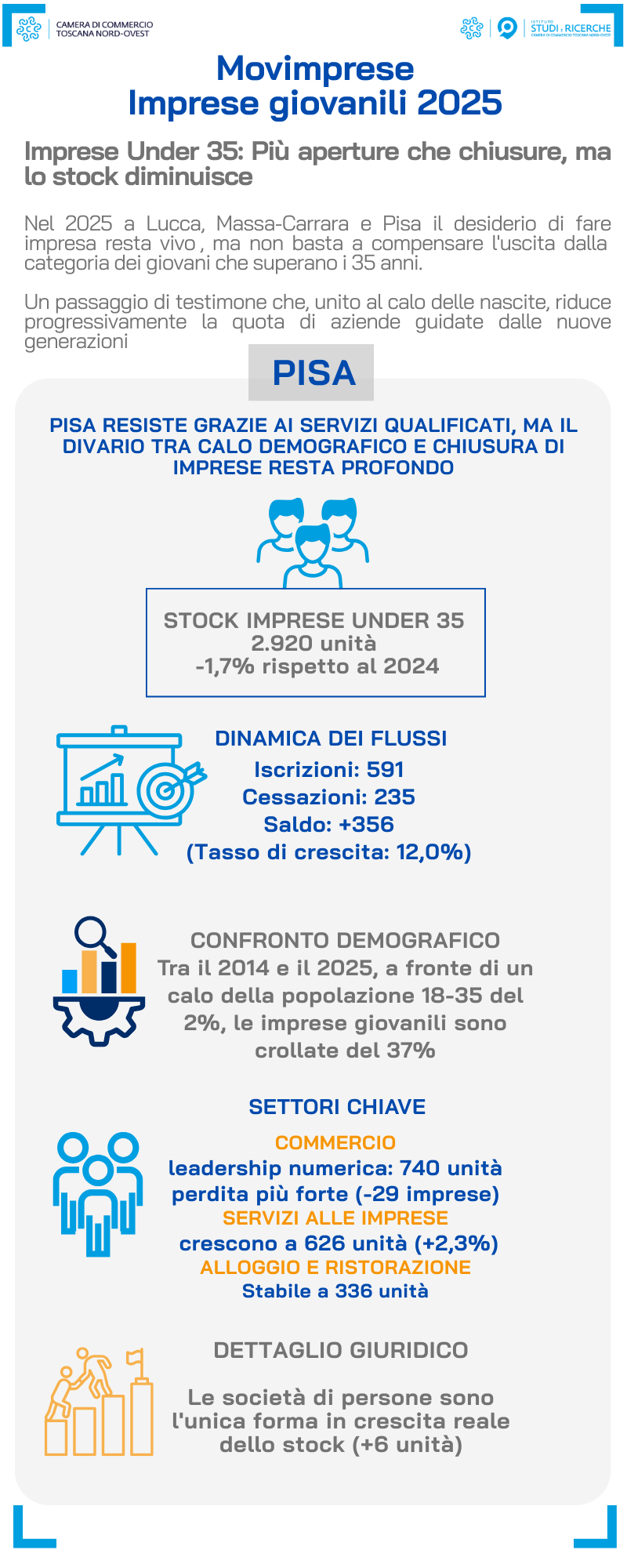 Nel territorio pisano la diminuzione è risultata più contenuta: le imprese giovanili si sono attestate a 2.920 unità, in calo dell’1,7%. Le nuove iscrizioni, pari a 591, hanno superato nettamente le cessazioni, fermatesi a 235, generando un saldo positivo di 356 unità. Anche in questo caso il ricambio non ha compensato le uscite dalla categoria per limiti anagrafici. L’incidenza sul totale provinciale si è attestata al 7,1%.Il commercio ha mantenuto il primato quale settore con la maggiore concentrazione di imprese giovanili pur avendo registrato una contrazione. I servizi alle imprese hanno chiuso l’anno in espansione consolidando il proprio ruolo dinamico, mentre il turismo ha messo in luce una sostanziale stabilità. Lieve diminuzione per costruzioni e industria, mentre l’agricoltura ha conservato livelli quasi invariati con ciò delineando un sistema produttivo giovanile che sta orientandosi verso i servizi. La presenza delle imprese under 35 è diffusa su tutto il territorio provinciale, in lieve flessione l’area pisana, stabile la Val d’Era e con valori relativamente più elevati nelle aree meno urbanizzate quale la Val di Cecina (incidenza 7,8%).