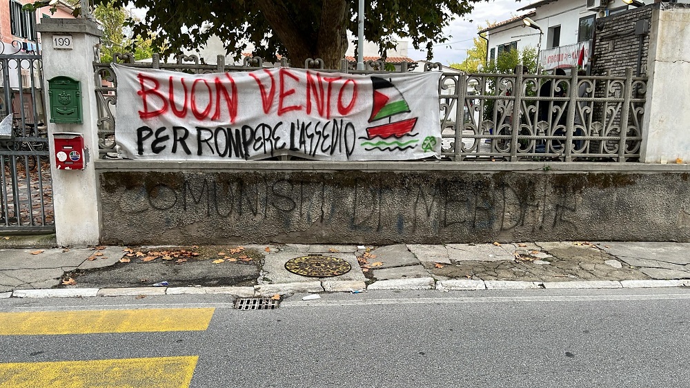 La scritta che vedete in foto è apparsa sul muro del nostro circolo, non a caso sotto lo striscione in supporto e solidarietà per la Global Sumud Flotilla.