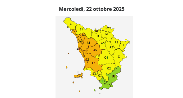 È stata emessa dalla Sala operativa regionale, per tutta la giornata di mercoledì 22 ottobre, una allerta arancione per rischio idrogeologico e temporali forti, valida per la Toscana centro-occidentale e l'Arcipelago.