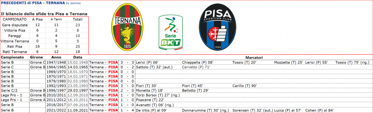 I PRECEDENTI Undici i precedenti in Umbria, spalmati fra la seconda e la quarta serie. Il Pisa vanta due vittorie molto distanti nel tempo far loro, fra prima risale infatti al 1965, la seconda alla passata stagione, quanto la rete dopo 9’ di De Vitis infranse anche il tabù ch voleva i nerazzurri senza goal segnati da ben 56 anni. A completare lo score nerazzurro a Terni ci sono anche quattro pareggi e cinque sconfitte. Per tutte le curiosità sulle due squadre è possibile riascoltare l’ultima puntata de “Il Chiavacci racconta il Pisa” andato in onda giovedì scorso alle 18:05 e riascoltabile sulla piattaforma Spotify.