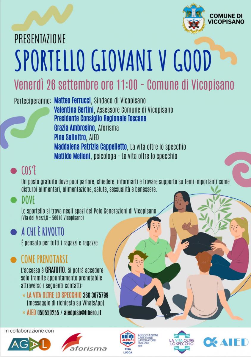È stato presentato venerdì 26 settembre lo Sportello Giovani V Good di Vicopisano, “un posto gratuito – spiega il Comune di Vicopisano rivolgendosi direttamente ai ragazzi e alle ragazze – dove puoi parlare, chiedere, informarti e trovare supporto su temi importanti come i disturbi alimentari, l’alimentazione, la salute, la sessualità e il benessere”.