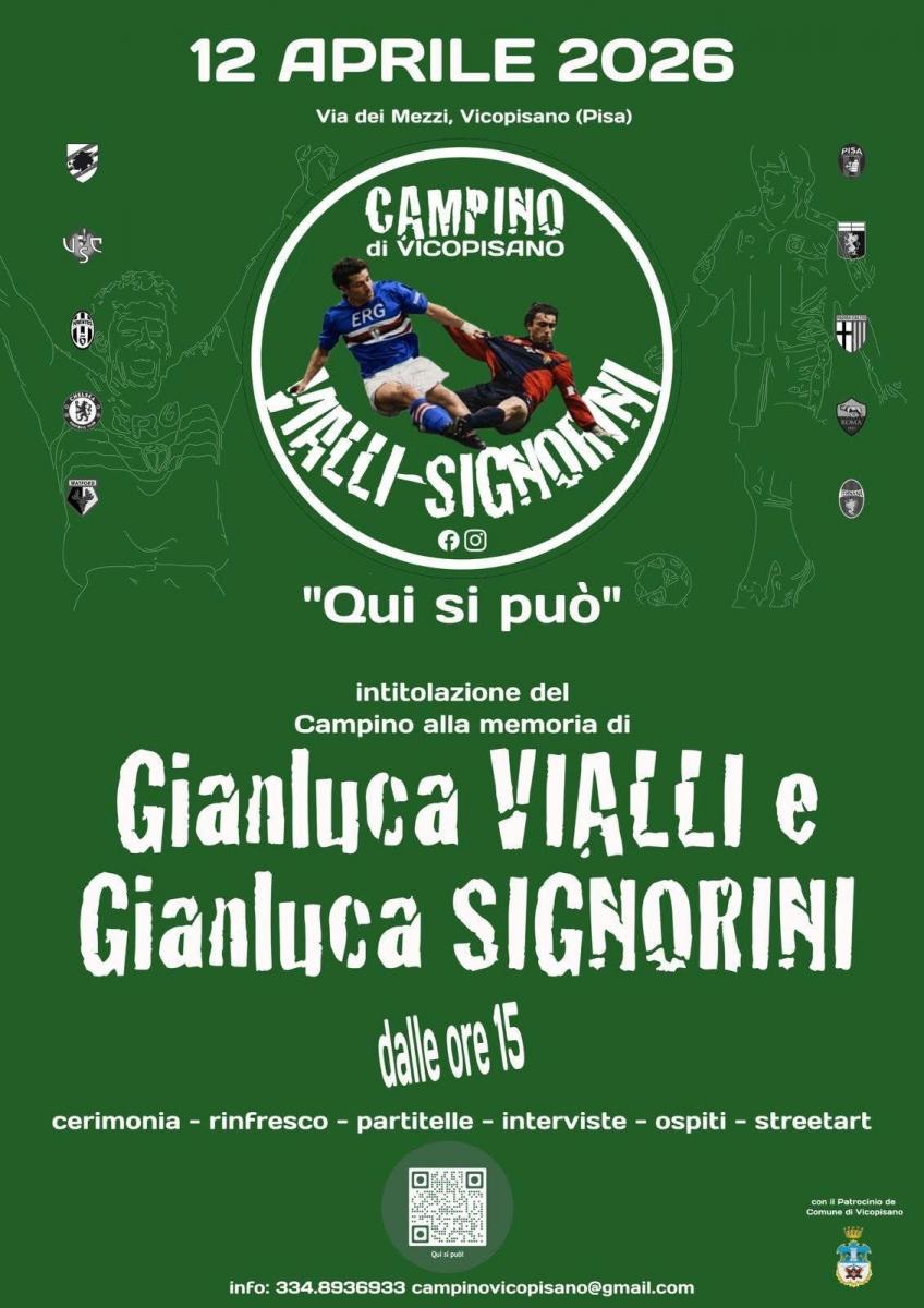 Un luogo di sport, crescita e comunità dedicato a due grandi nomi del calcio italiano. Domenica 12 aprile, dalle ore 15:00, in via dei Mezzi, Vicopisano intitolerà il proprio Campino “Qui si può” a Gianluca Vialli e a Gianluca Signorini, al termine di un percorso condiviso tra cittadini, famiglie e Amministrazione comunale, che ha contribuito alla valorizzazione dello spazio polivalente anche con l’installazione, tra l’altro, di reti e porte.