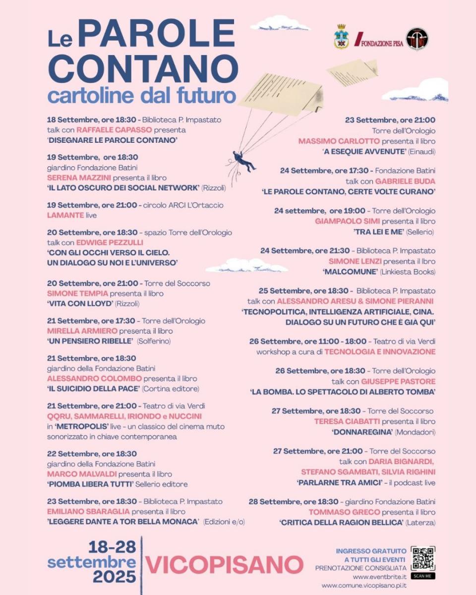 Vicopisano torna ad accendersi di idee, libri e visioni con la settima edizione del festival Le Parole Contano - Cartoline dal futuro, dal 18 al 28 settembre, promosso da The Thing Promozione Eventi, in collaborazione con l’Amministrazione Comunale e il prezioso sostegno della Fondazione Pisa.